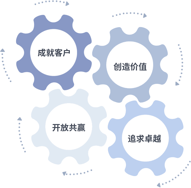 成就客户是一切决策的出发点,,创造价值是衡量所有工作的标准,,,追求卓越是我们做事做人的态度,,,开放共赢是我们的格局也是最终的结果。。。。价值观的齿轮环环相扣,,推动着组织里的每个人不断向前。。。。
