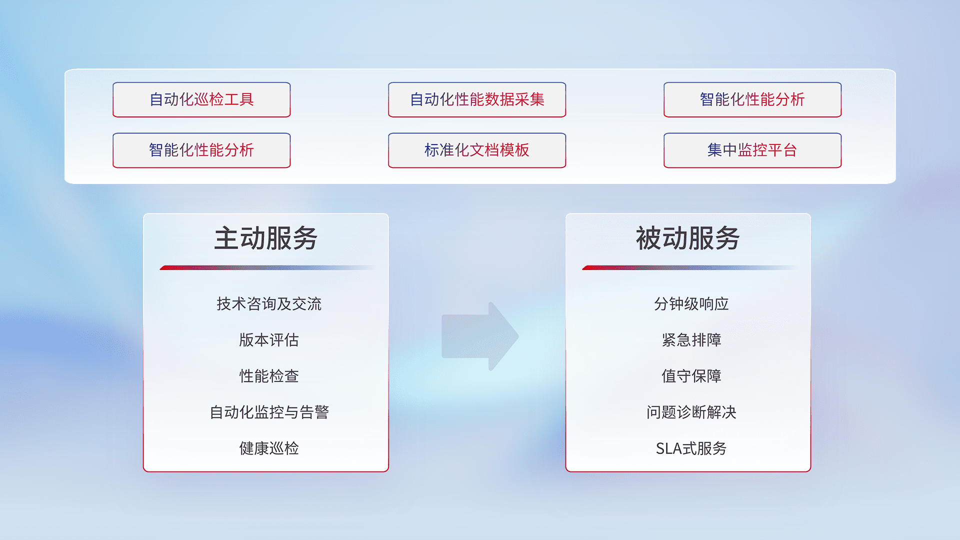 智能化工具和标准化文档,,保障服务质量,,提供主动服务(包含技术咨询、、版本评估、、、性能检查、、、、自动化监控与告警、、健康巡检)和被动服务包含(分钟级响应、、紧急排障、、值守保障、、、问题诊断解决、、SLA服务)。。。。